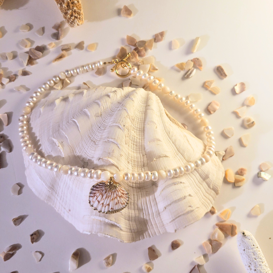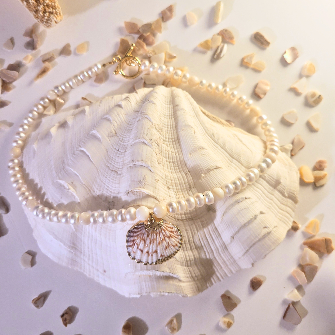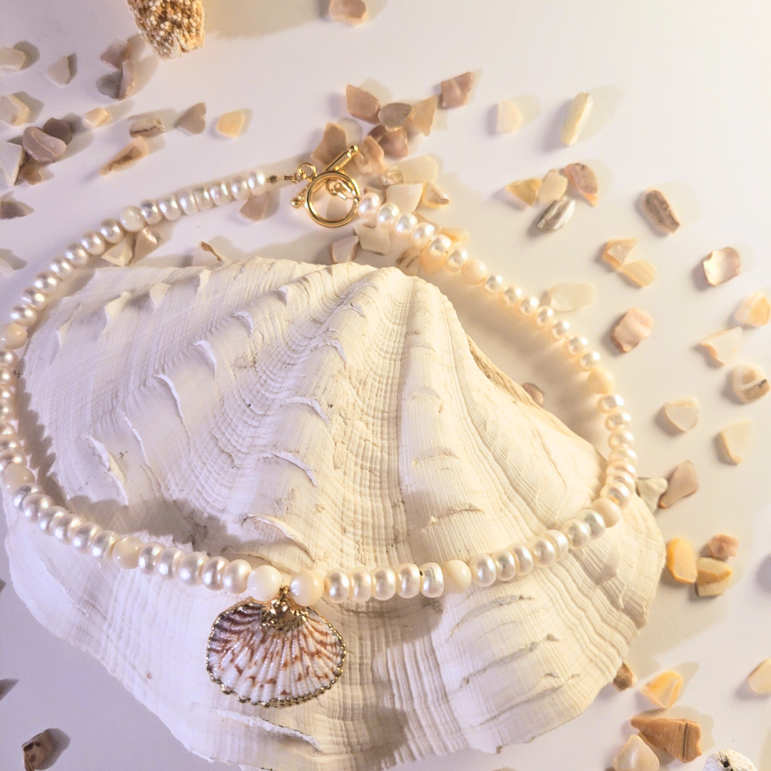 Handmade Necklace with Fresh water pearl and shell with seashell charm and 18k gold plated attachments.